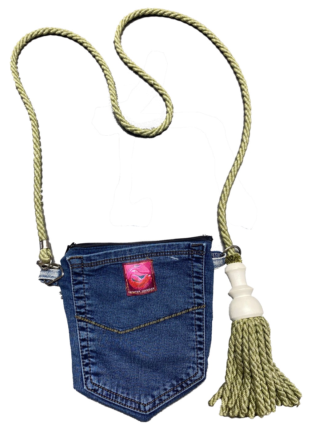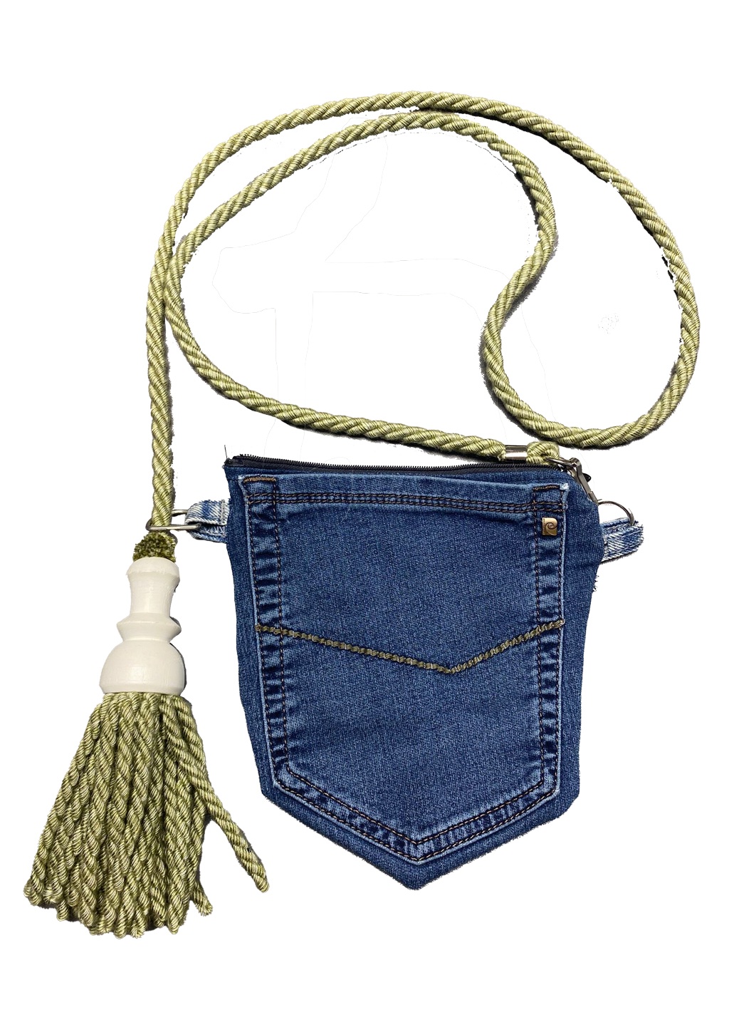 | Een leuk festivaltasje voor enkel het hoogst noodzakelijke om mee te nemen. Het is gemaakt van 2 achterzakken van een jeans, de rits uit deze jeans en 2 riemlusjes. De schouderband is gemaakt van een retro gordijnkoord. Het tasje is cross body te dragen. |