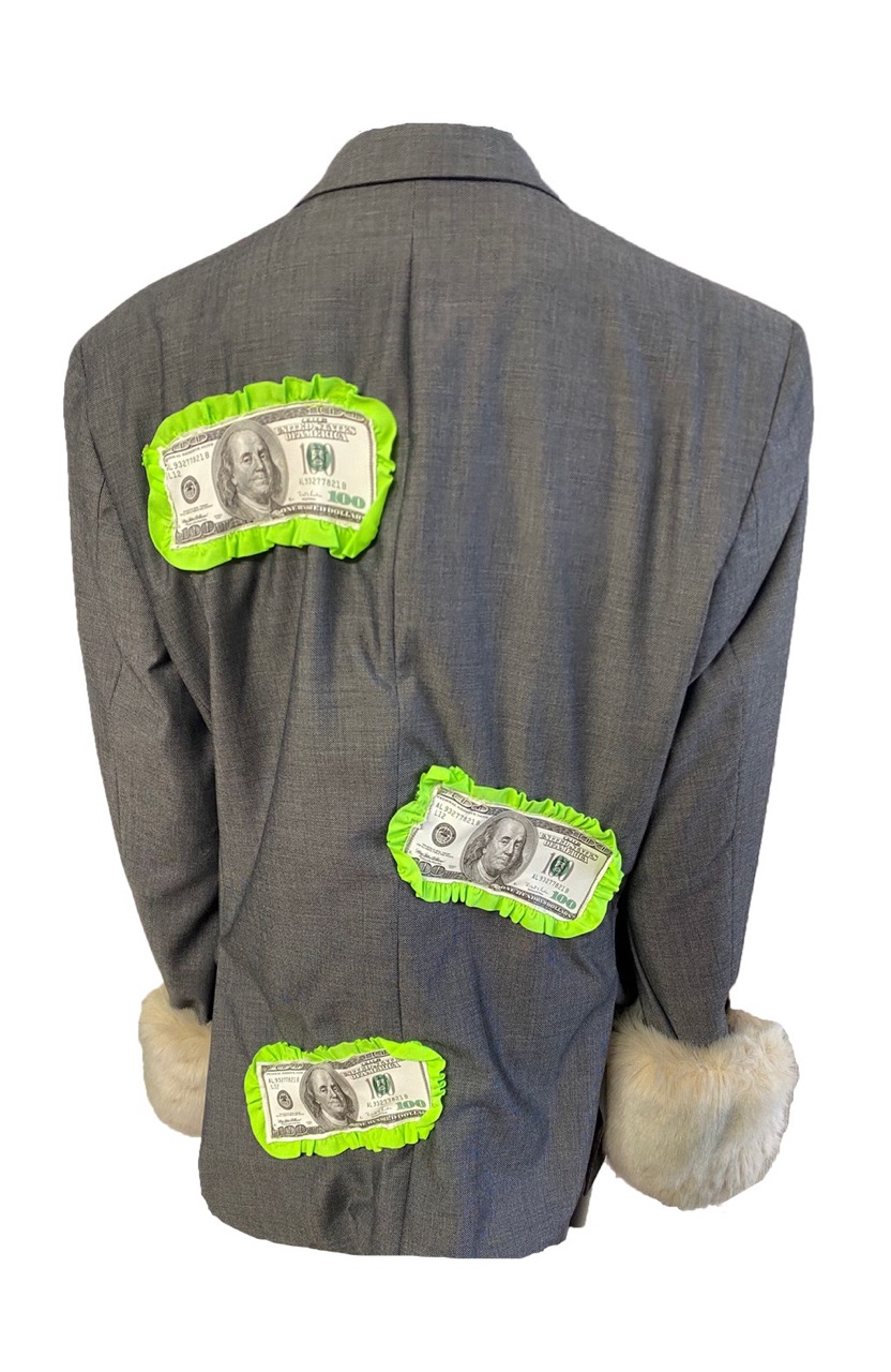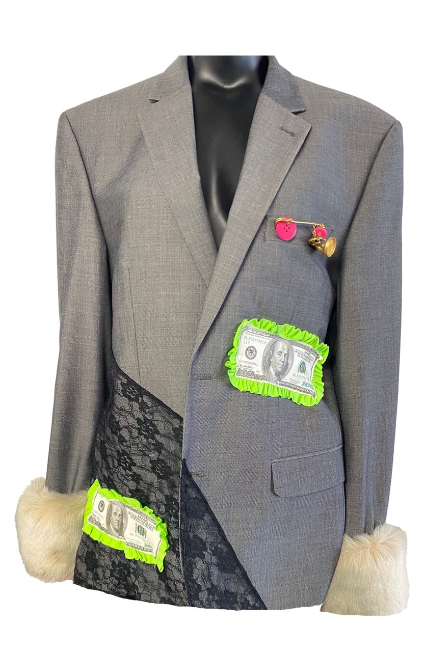 Dit eigenzinnig bewerkte herencolbert is nu zó dames trendy dat het weer een echte eyecatcher is. Met het kant op het voorpand en de bontrandjes langs de mouwen een gewaarde combinatie. Het wordt compleet gemaakt met groen omrande dollarbiljetten die willekeurig op het jasje zijn vastgenaaid.