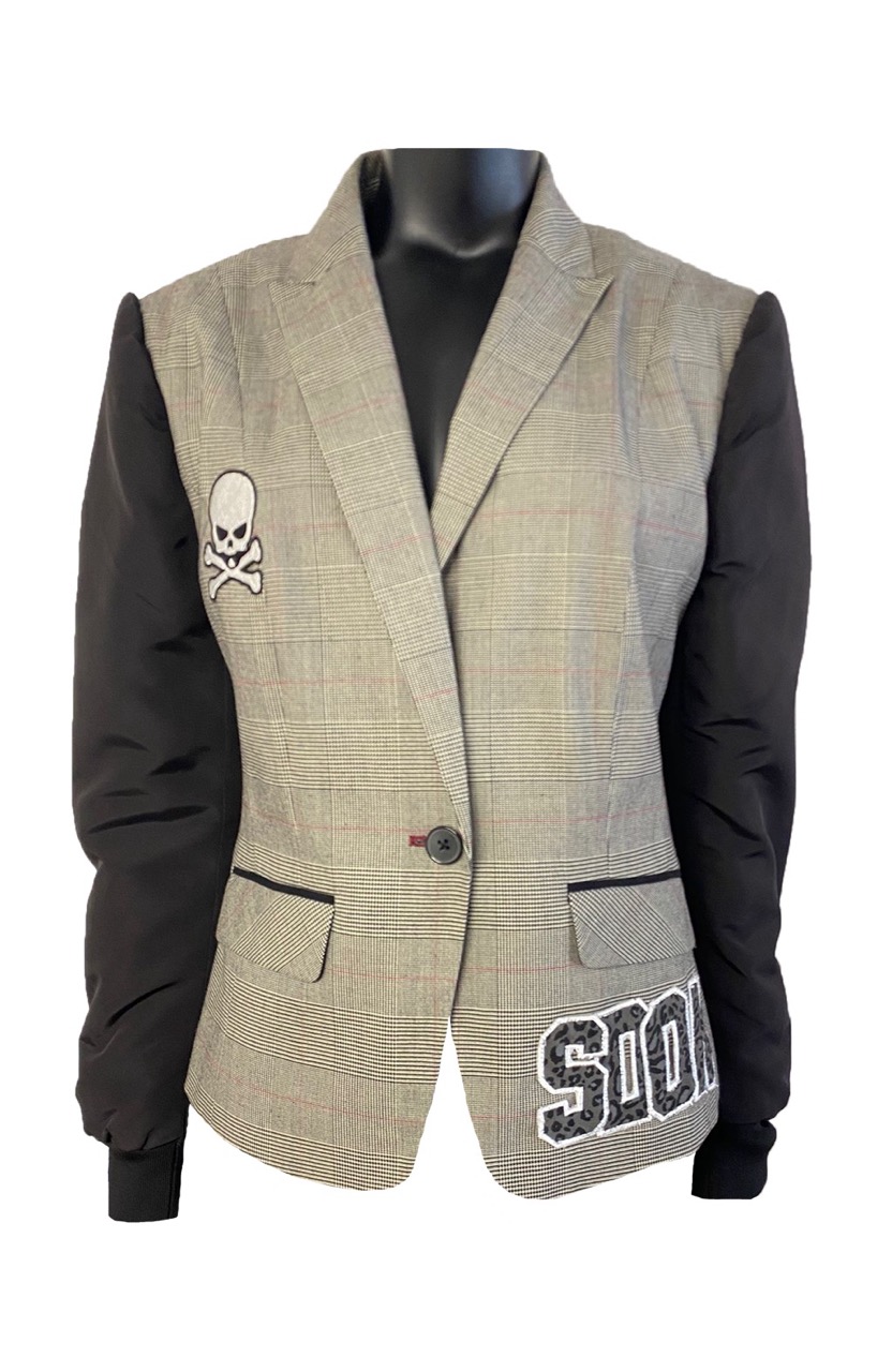 Dit lijkt nu eerder op een stoer bomberjack dan op een zakelijk colbert en toch ligt de basis bij het colbert. De toegevoegde mouwen vanuit het bomberjack met daarnaast wat stoere applicaties, maakt het een aantrekkelijk geheel voor iemand die wél een colbert wil dragen maar tegelijkertijd niet te zakelijk wil overkomen. Durf jij het aan?